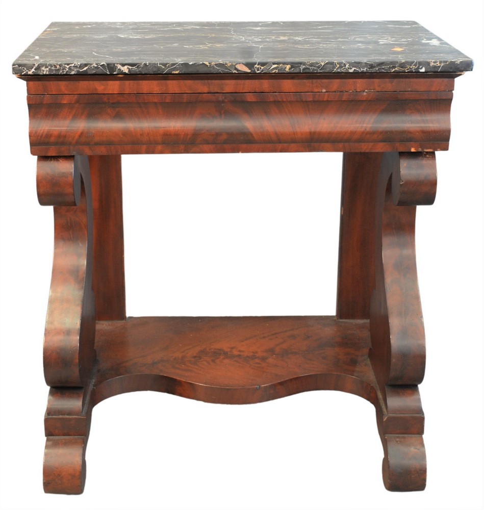 Empire Style Mahogany Hall Table, having marble top over one drawer, height 34 inches, top 18″ x 31 1/2″.