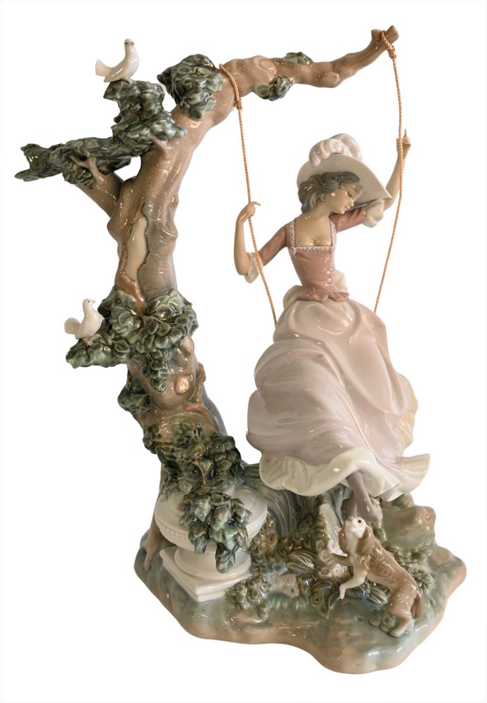 Large Porcelain Lladro Figure, “Victorian Girl on a Swing” by Salvador Debon, marked to the underside, overall height 13 1/2 inches.