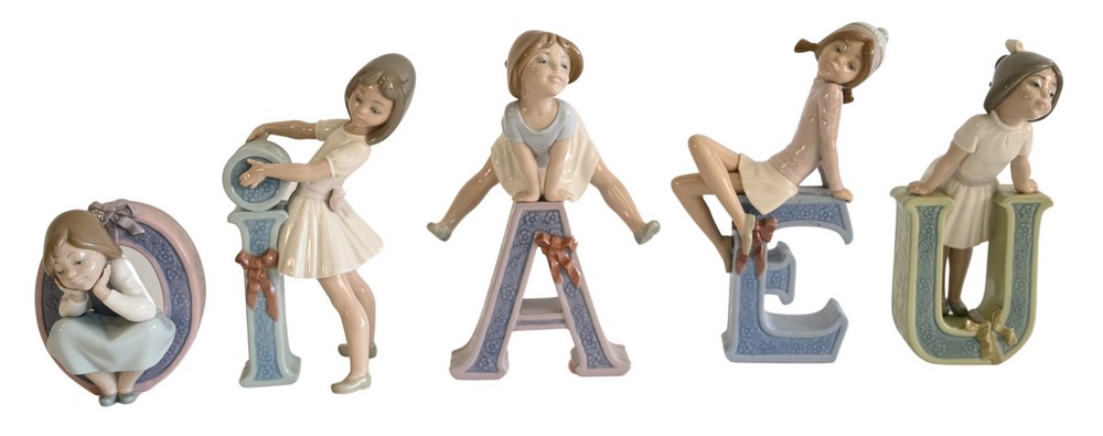 Five Piece Lot of Porcelain Lladro Figures, to include the five vowels “AEIOU”, each accompanied by original box, height of tallest …