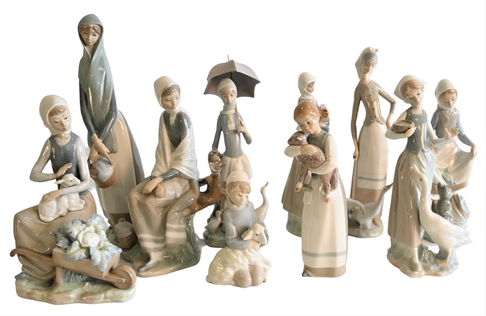Ten Piece Lot of Porcelain Lladro Figures of Girls with Animals, to include “Aldeana Con Gallo”, “Comida Para El Conejo”, “Nina Cord…