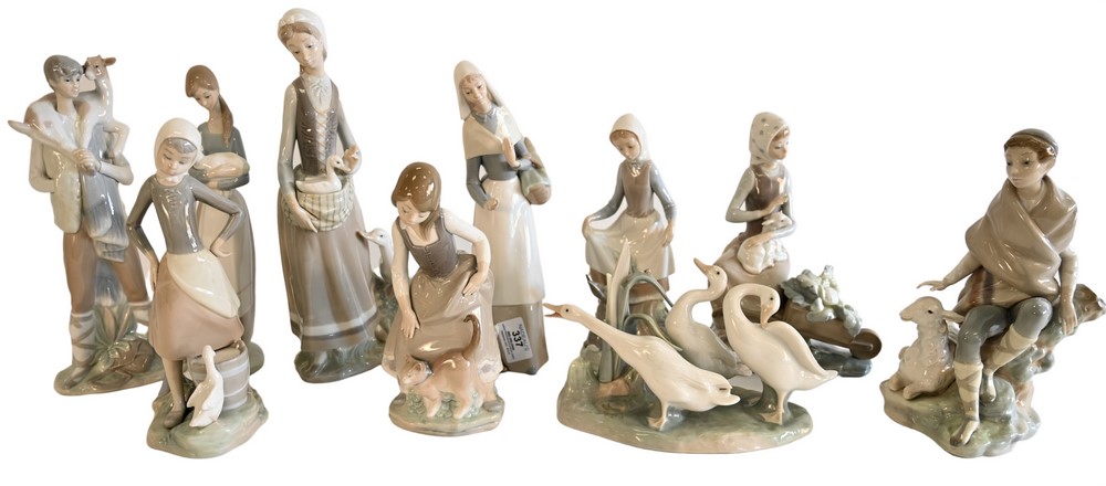 Ten Piece Lot of Lladro Porcelain Figures, to include several children with animals, along with one having three white ducks, severa…
