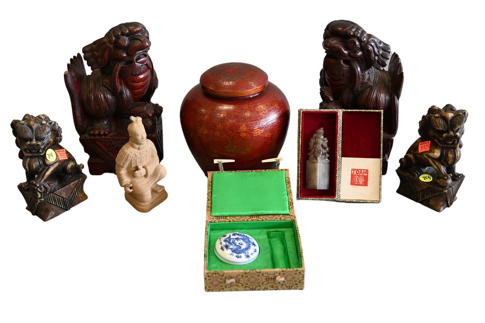 Eight Piece Chinese Lot, to include a pair of carved wooden foo dogs, a pair of soapstone foo dogs, terracotta kneeling army figure,…