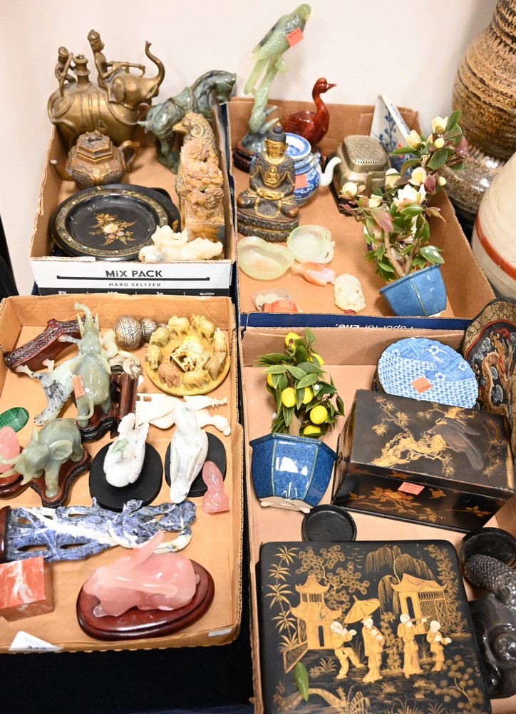 Four Tray Lots of Small Chinese Items, to include several hardstone animals, a pair of foo lion bookends, a brass ram, a brass and b…