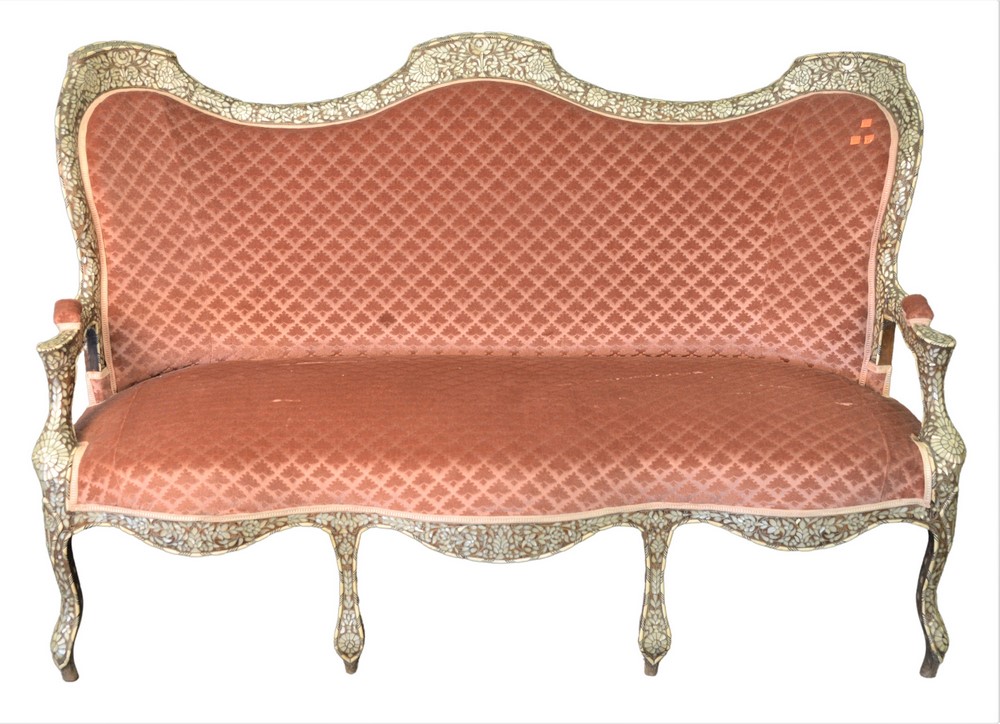 Syrian Mother of Pearl Inlaid Sofa, having upholstered seat and back with frame depicting Turkish crescent moon and star, height 43 …