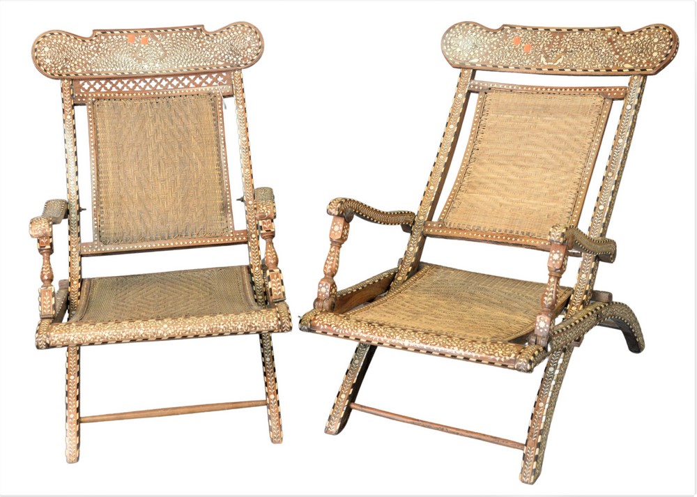Pair of Moroccan Mother of Pearl Inlaid Folding Chairs, having woven seats and backs, height 32 inches, width 21 inches.