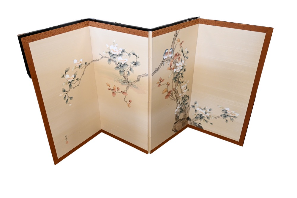 Group of Three Oriental Four Fold Screens, painted on silk, length 60 inches.