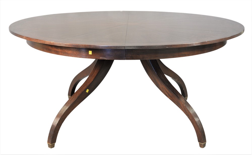 Custom Mahogany Round Dining Table, having two extra leaves, on pedestal base, height 29 inches, diameter 63 inches, opens to 111 in…