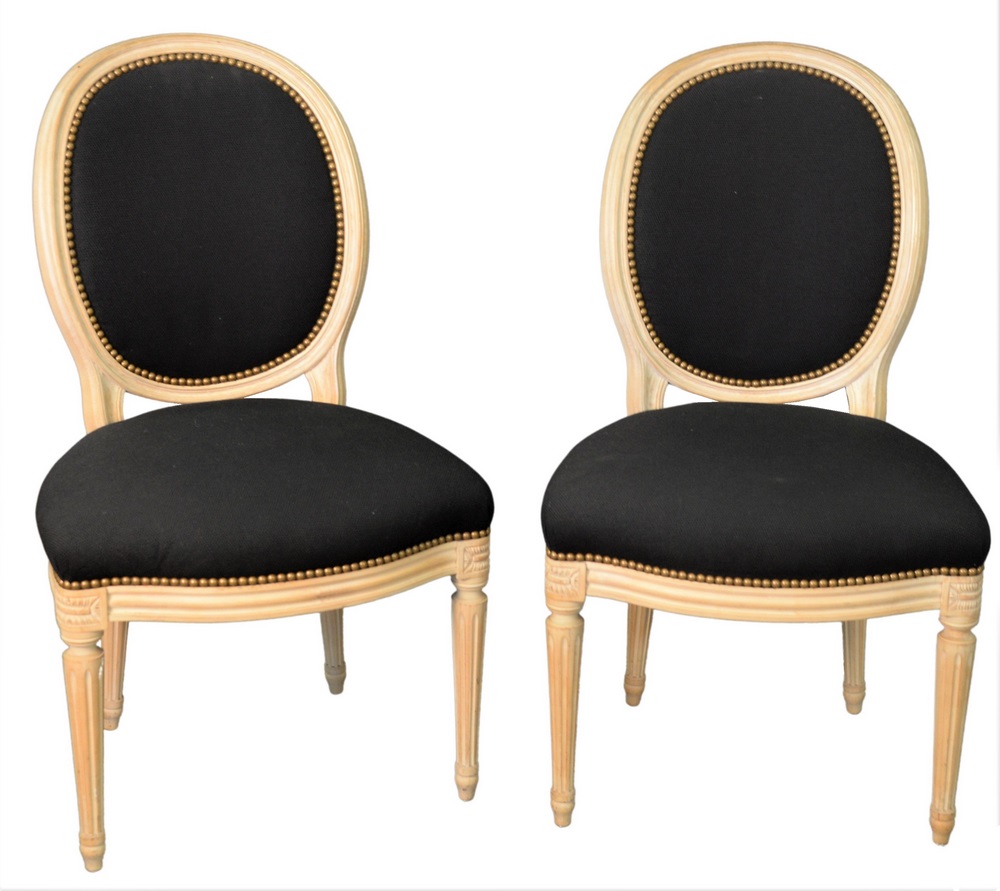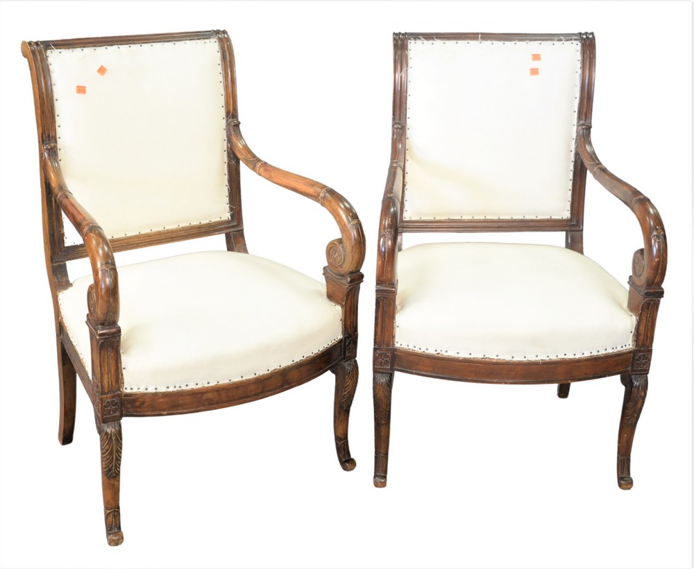 Pair of Directoire Style Armchairs, in need of upholstery, height 35 inches, width 21 1/2 inches.