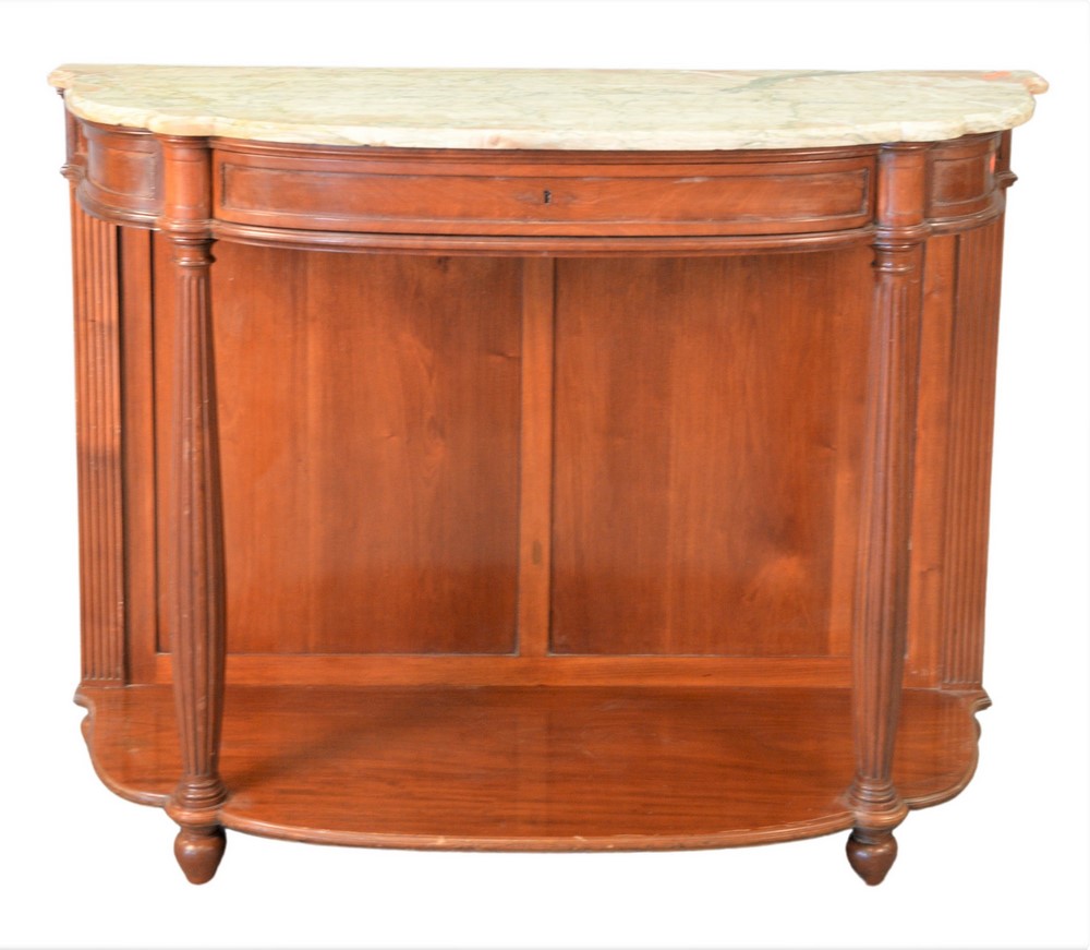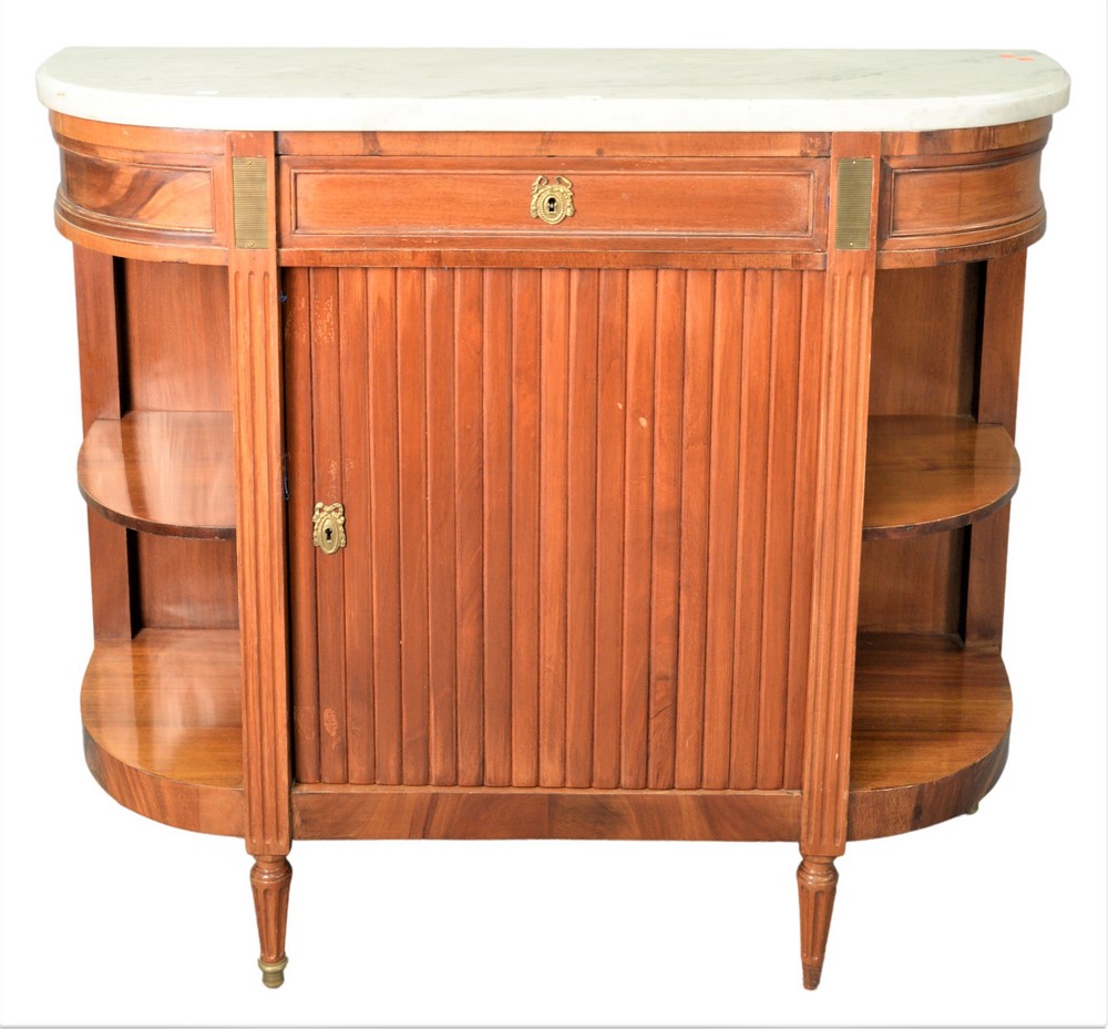 Louis XVI Style Marble Top Server, having drawer and door, height 39 inches, width 46 inches, depth 17 inches.