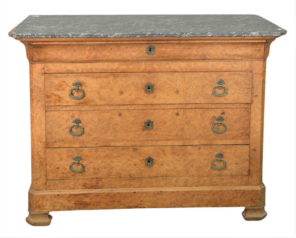 Burlwood Server, having marble top and three drawers over bracket base, height 38 inches, width 51 inches, depth 24 inches.