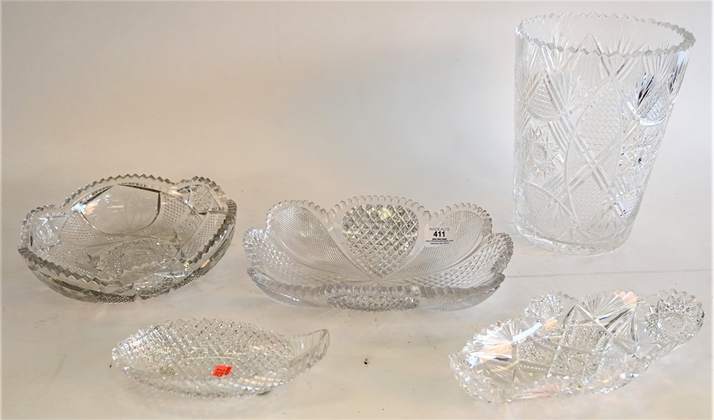 Five Piece Lot of Cut Glass, to include a large vase, an ice cream bowl, a dish having sunflower motif, along with two dishes, heigh…