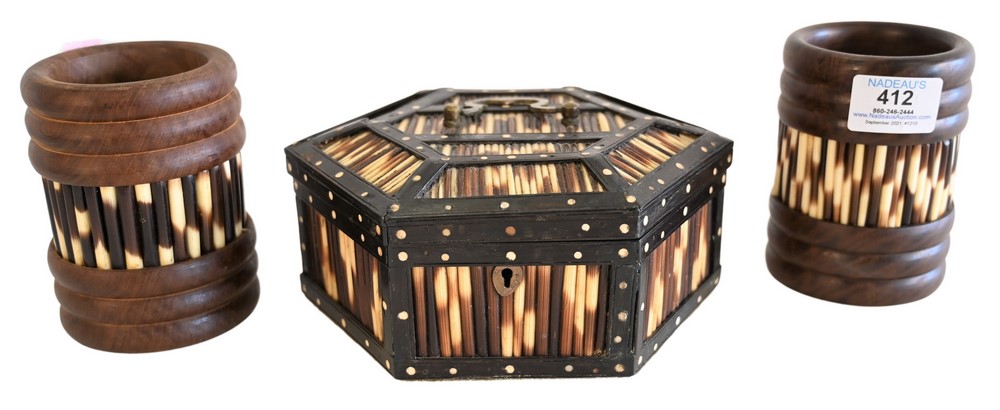 Three Piece Porcupine Quill Lot, to include a hexagonal box having hinged top, along with a pair of turned wood and quill cups, heig…