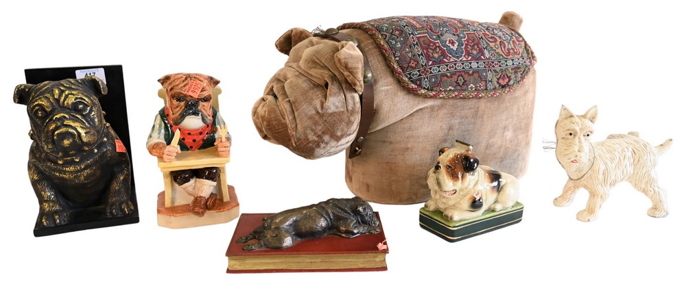Six Piece Dog Themed Lot, to include a Takahashi ceramic tape dispenser, an iron terrier door stop, Kevin Francis ceramic bulldog fi…