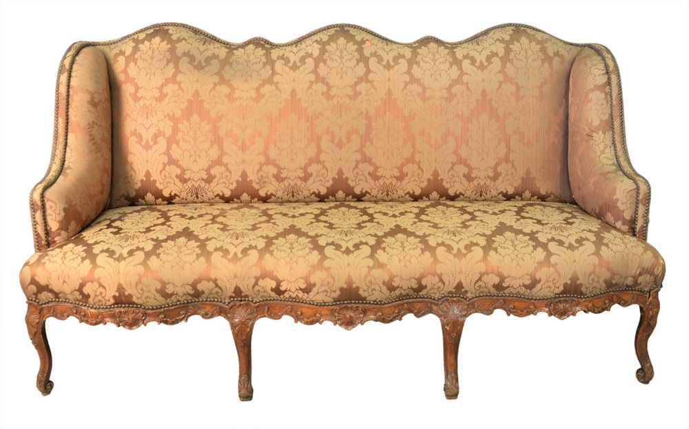 Louis XV Upholstered Sofa, having serpentine front and carved frame (legs repaired), height 41 1/2 inches, length 77 inches.