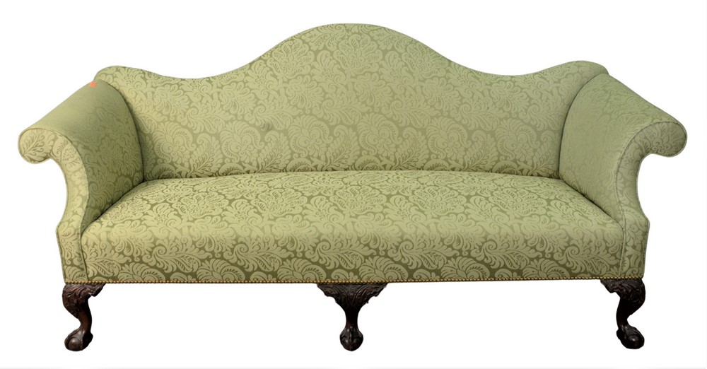 Chippendale Style Upholstered Sofa, having rolled arms and carved legs ending in ball and claw feet, height 38 inches, length 84 inc…