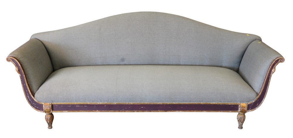 Custom Upholstered Sofa, having paint decorated frame and carved feet, length 90 inches.
