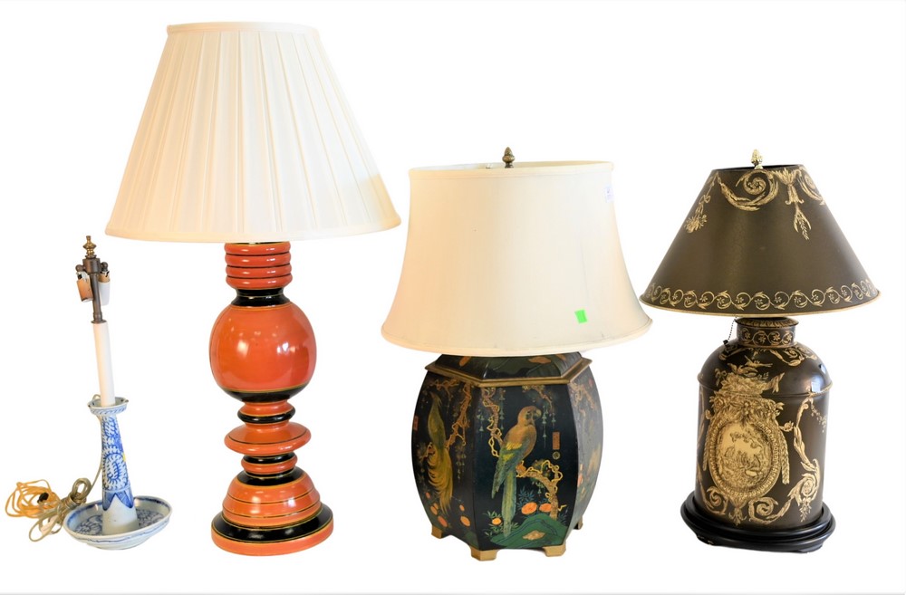 Four Piece Lot of Table Lamps, to include a Chinese style painted metal table lamp having bird motif on each panel, a brown metal ta…