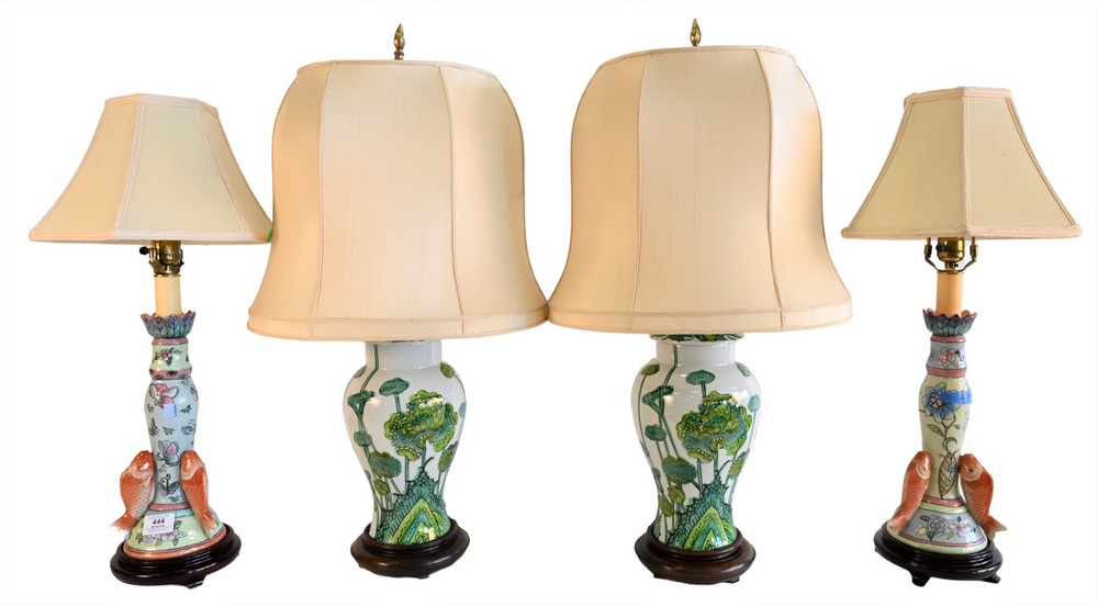 Two Pairs of Asian Style Table Lamps, to include a pair having koi fish forms mounted to the shaft, along with a pair having green a…
