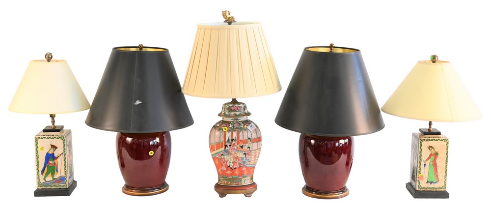 Five Piece Lot of Chinese Table Lamps, to include a pair of oxblood vases, a pair of square vases, each panel having figural and fol…