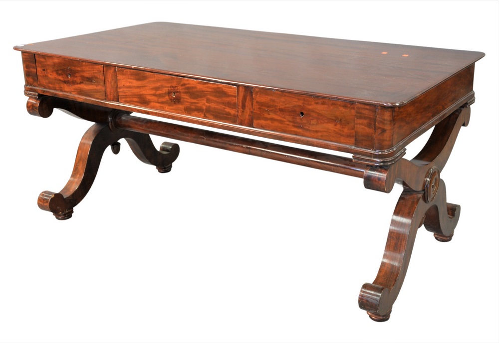 Empire Style Mahogany Writing Table, having three drawers, height 30 inches, top 35″ x 63″, (one chip to top 1″ x 2″).