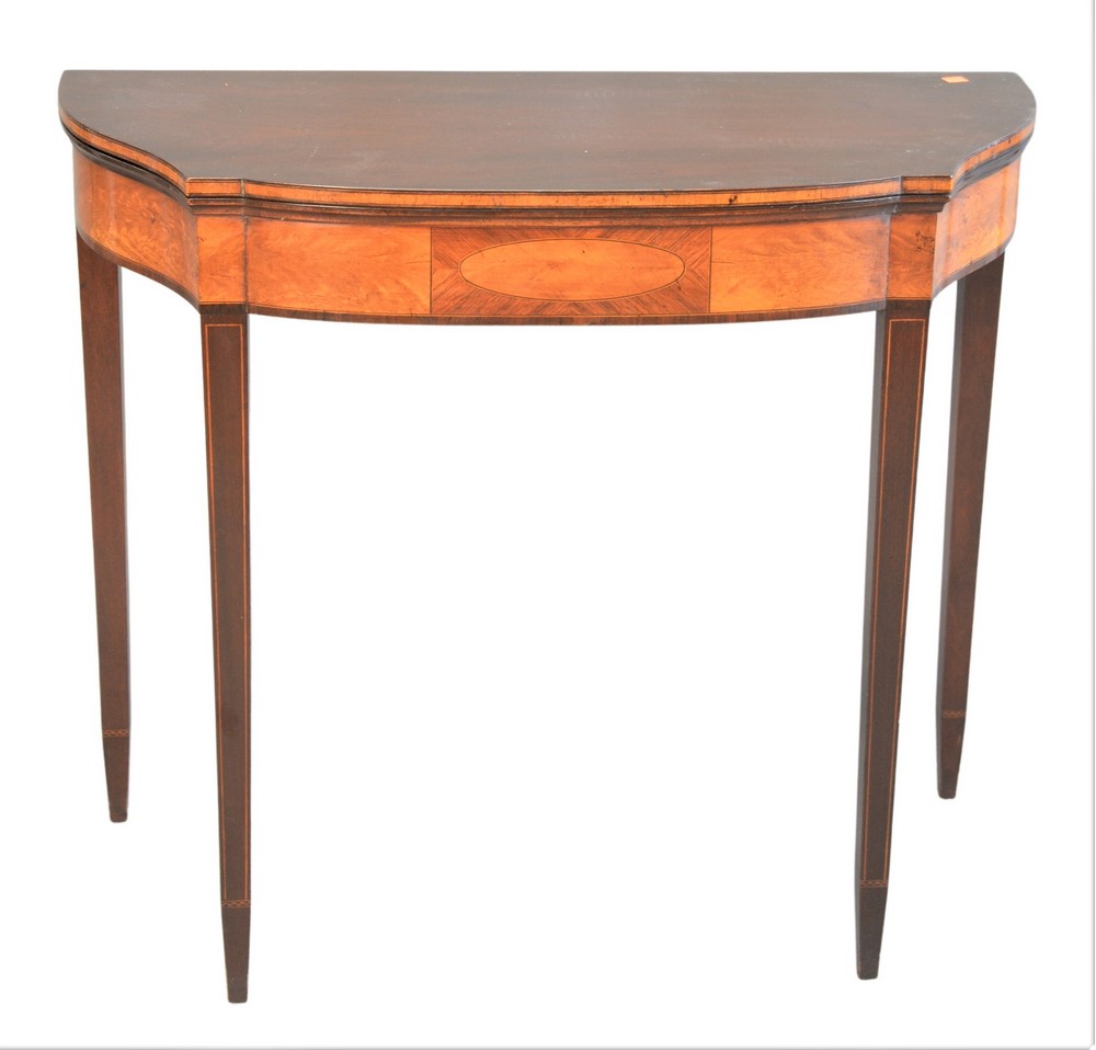 Custom Mahogany Federal Style Game Table, having panel flame birch inlays, height 31 inches, width 36 inches, depth 16 inches.