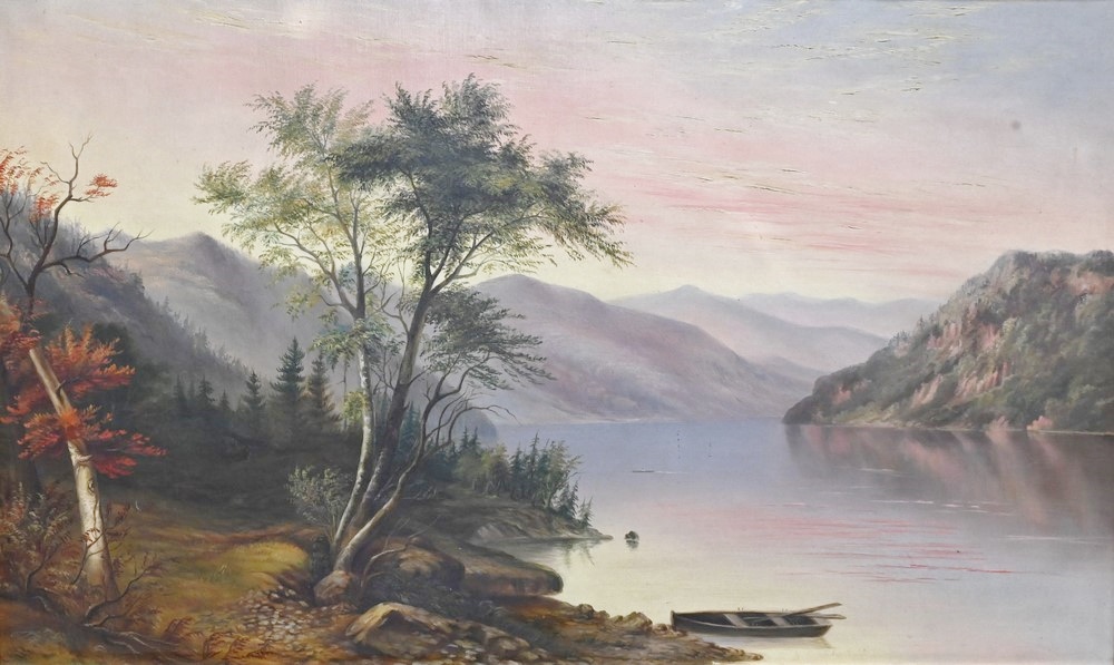 Two Piece Framed Group, to include Hudson River School landscape “Lake George” day, oil on canvas, along with engraving of same scene, oil on canvas 22″ x 36″.