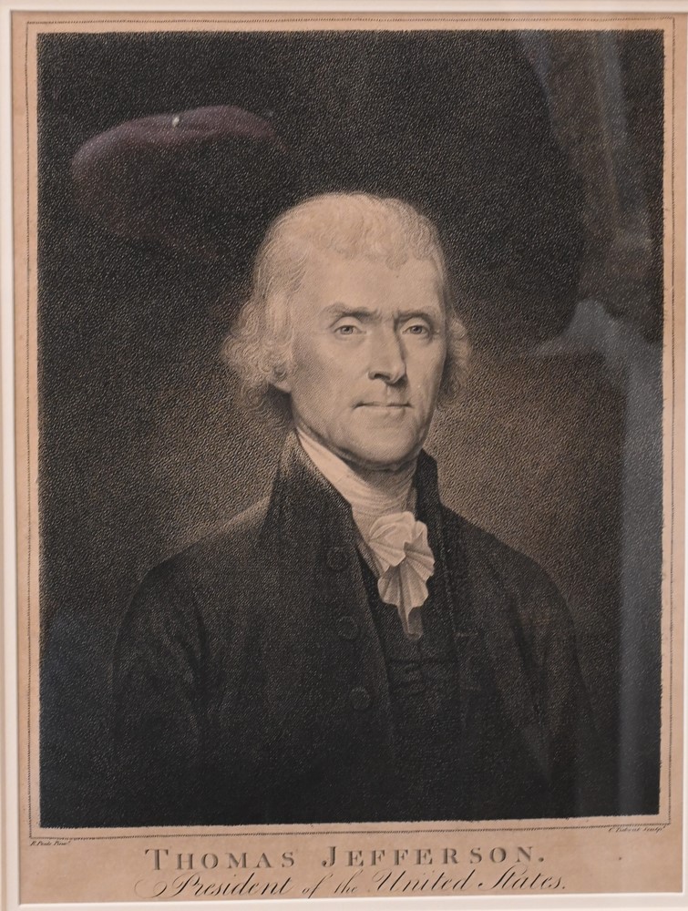 Thomas Jefferson, portrait, sculpted by Cornelius Tiebout after Peale, lithograph, sight size 9 7/8″ x 13 1/2″. Provenance: Sotheby’s New York Sale 6660, lot 1508, January 24, 1995.