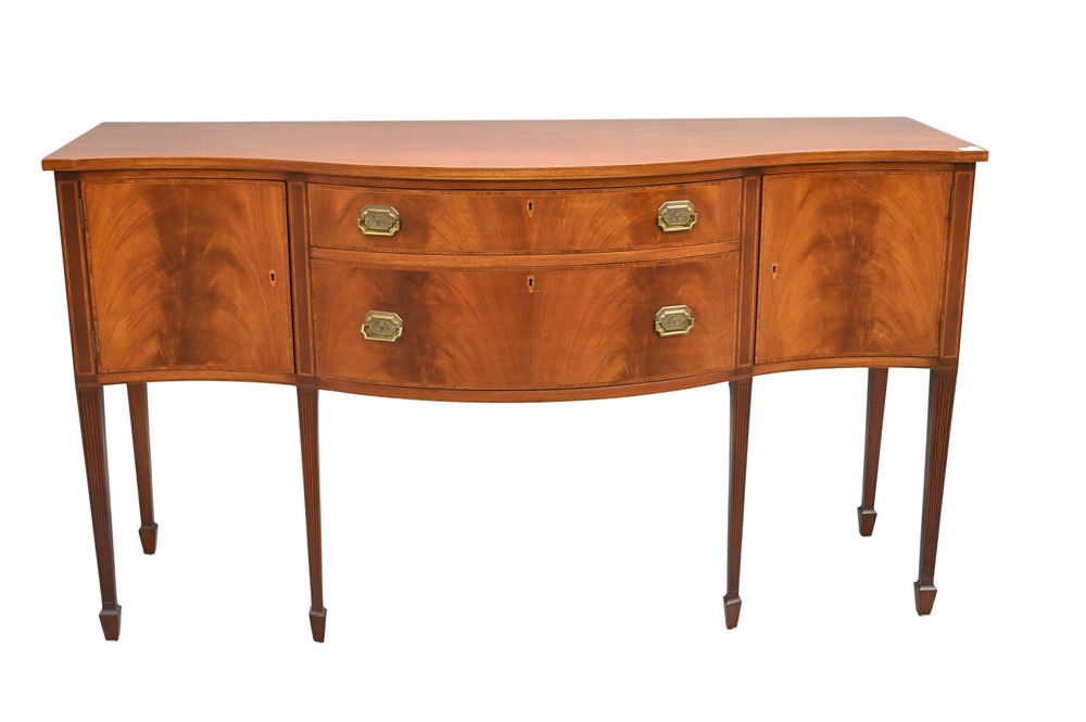 Margolis Mahogany Serpentine Sideboard, having two drawers flanked by doors on fluted square tapered legs with fitted silver drawer, height 37 inches, top 24″ x 66″.