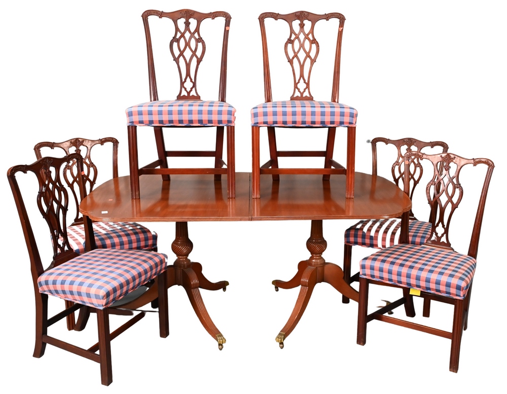 Margolis Seven Piece Dining Set, to include six chippendale style chairs with fully upholstered seats and shaped top table on double pedestal base, height 29 inches, along with three 12 inch leaves, opening to 43 x 98 inches, table top 43″ x 62″.