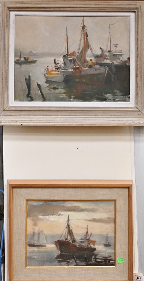 Two Harry Russell Ballinger (American, 1860 – 1938), harbor scene, oil on canvas board, signed lower right “H.R. Ballinger”, 9″ x 12″; along with fishermen on the wharf, oil on canvas, signed lower right, 12″ x 16″. Provenance: Fifty Year Personal Collection of Clocks and American Antiques from Thomas Bailey, Manchester, Connecticut.