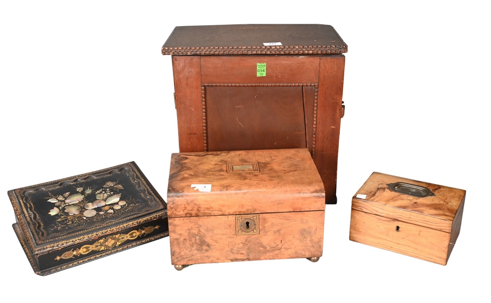 Four Piece Group, to include two burl walnut boxes, one door cabinet with fitted interior, a black lacquered and mother of pearl lap desk, height 15 inches.