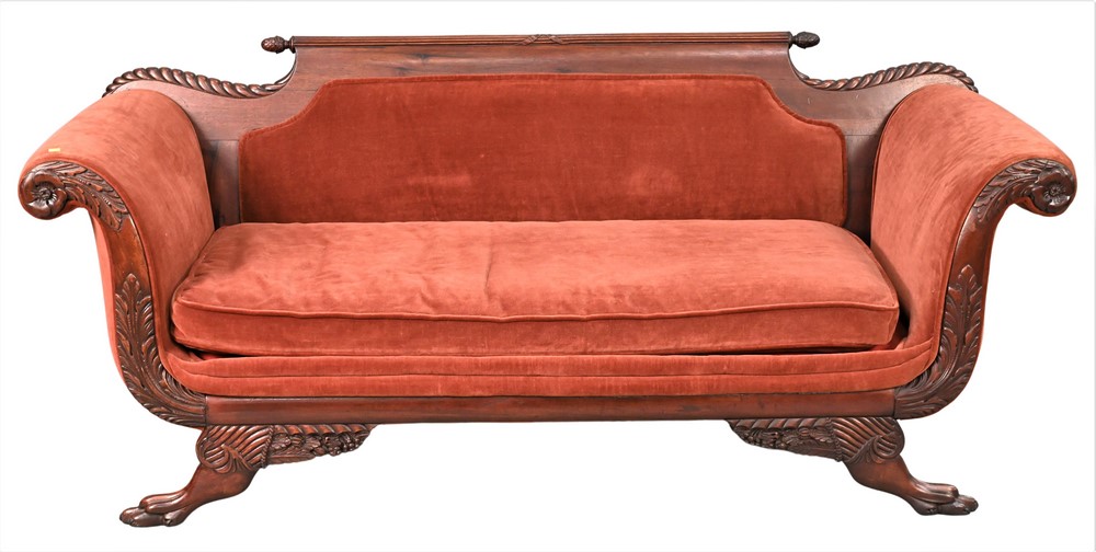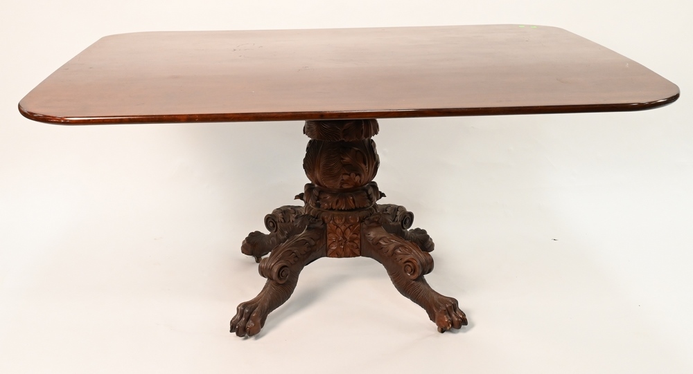 Federal Mahogany Breakfast Top Table, having rectangular top on intricately carved base, set on carved paw feet, single board top, circa 1840, probably New York, height 29 inches, top 29 inches, top 48 x 60 inches