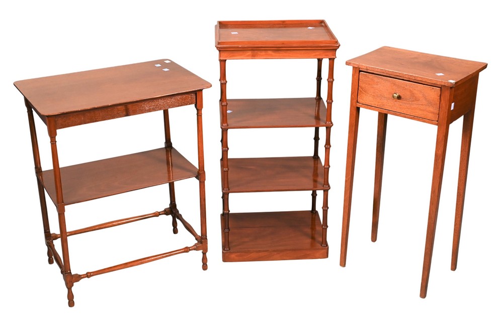 Five Piece Lot, to include tall one drawer stand, four tier etagere, along with a two tier open shelf, height 31 1/2 inches; along with two oak stands.