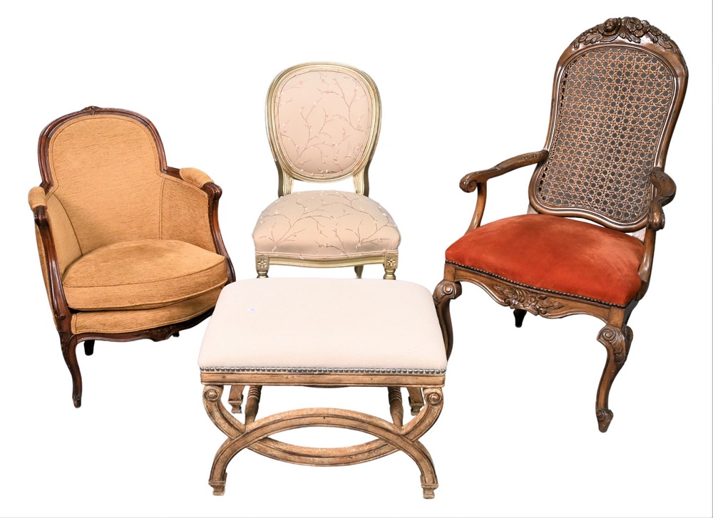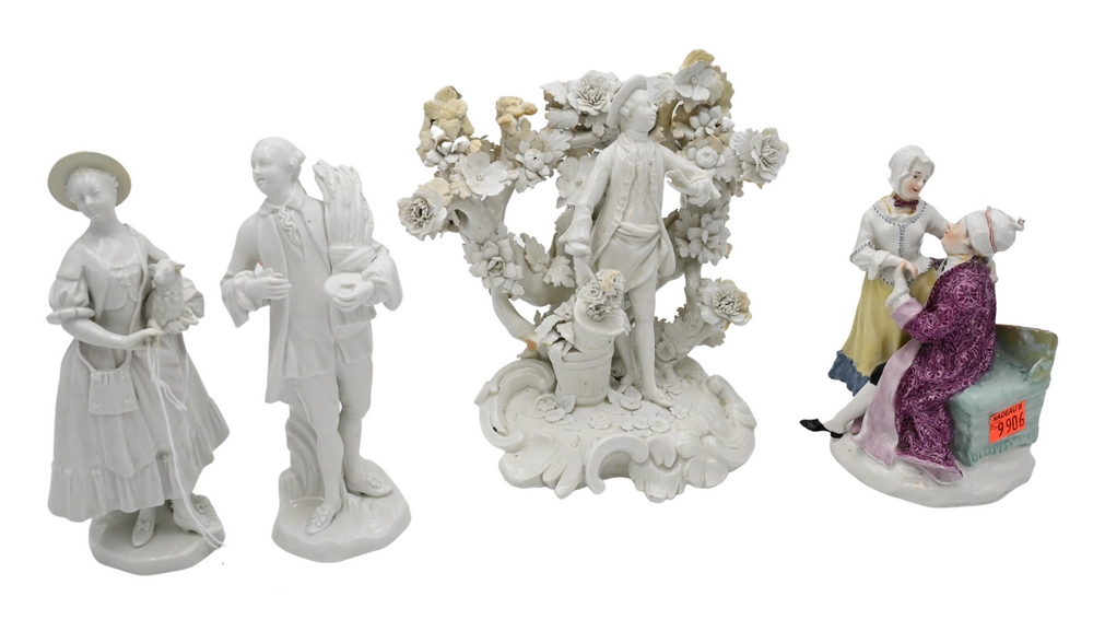 Four Piece Porcelain Group, to include Vienna white figural group with beehive mark, repaired; Viennese figure of a shepherdess; polychrome lovers group, along with a Vienna figure of a man with wheat sheaves, (as is), shepherdess height 7 3/4 inches, lovers group height 6 1/2 inches, man height 7 3/4 inches.