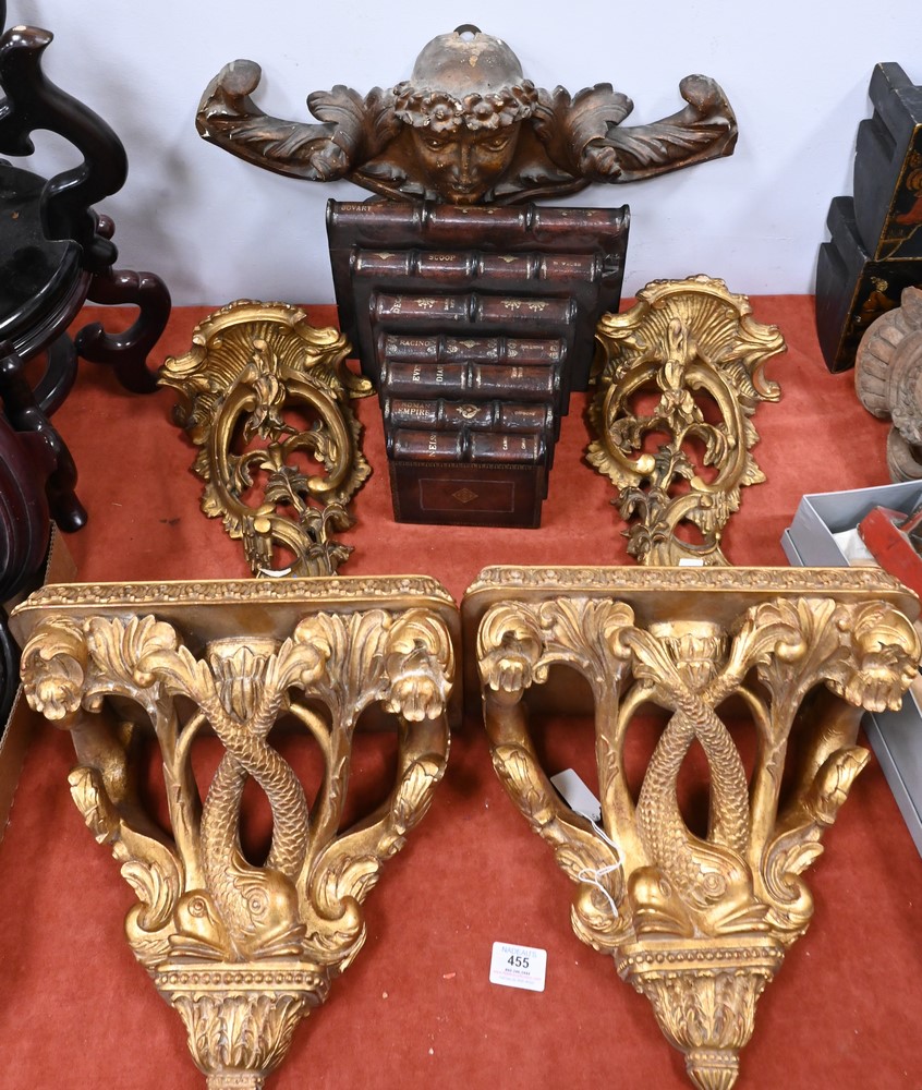 Six Piece Group, to include pair of gilt hanging shelves with fish supports, pair of victorian hanging shelves, book hanging shelf and a carved wood and gesso figural piece; tallest 13 inches.