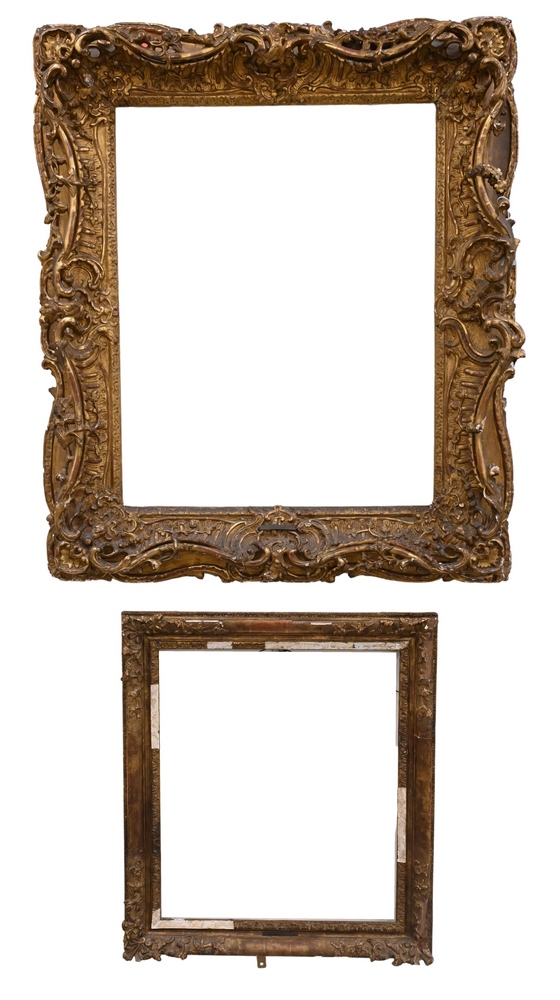 Two Heavily Carved Gilt Frames, largest 18th century, smaller 19th century, largest outside 42″ x 36 1/2″, inside 32″ x 26 1/4″; smallest outside 28″ x 25″, inside 23 1/4″ x 19 3/4″.