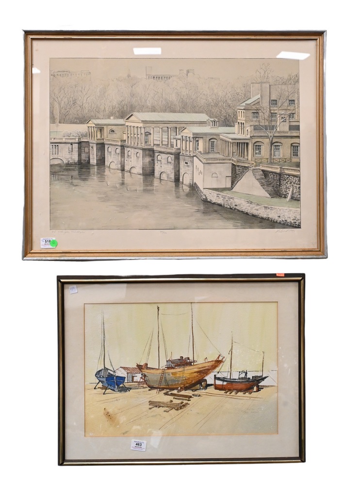 Two Framed Pieces, to include Richard Haas (American, b. 1936), Old Waterworks, Philadelphia, aquatint in colors on paper, signed, titled, and numbered 201/235 in pencil throughout the lower margin, image size 18″ x 25.5″; along with a watercolor, harbour scene, signed illegibly, 13.5″ x 18.5″.