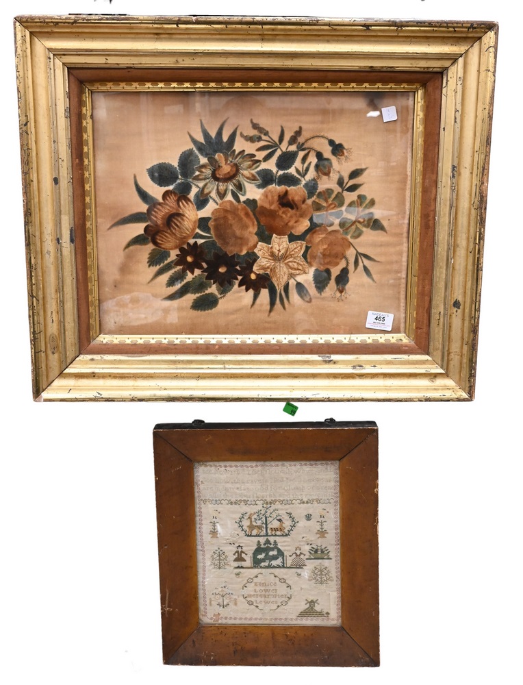 Two Framed Pieces, to include folk art still life of flowers, signed Eunice Lower; needle point school sampler, signed Samples Lewes; still life 16″ x 21″.
