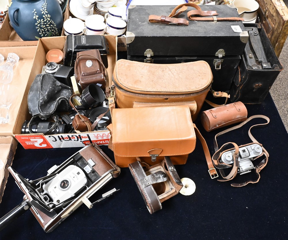 Group of Cameras, to include Voigtlander Vitomatic camera, microscope, Yashica camera, Kodak 35 camera, Rolleiflex Bell and Howell 16mm movie camera, along with Nikon F.