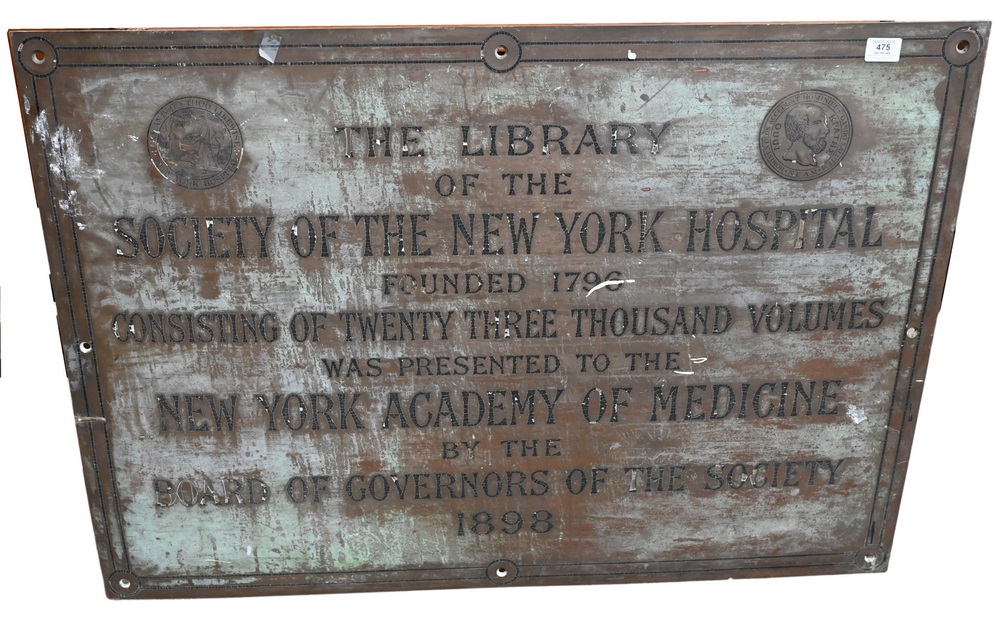 Gorham Bronze Enameled Plaque, The Library of the Society of the New York Hospital, founded 1796, consisting of twenty three thousand volumes, was presented to The New York Academy of Medicine, by the Board of Governors of the Society 1898, marked Gorham. 30″ x 42″ Provenance: The New York Academy of Medicine.
