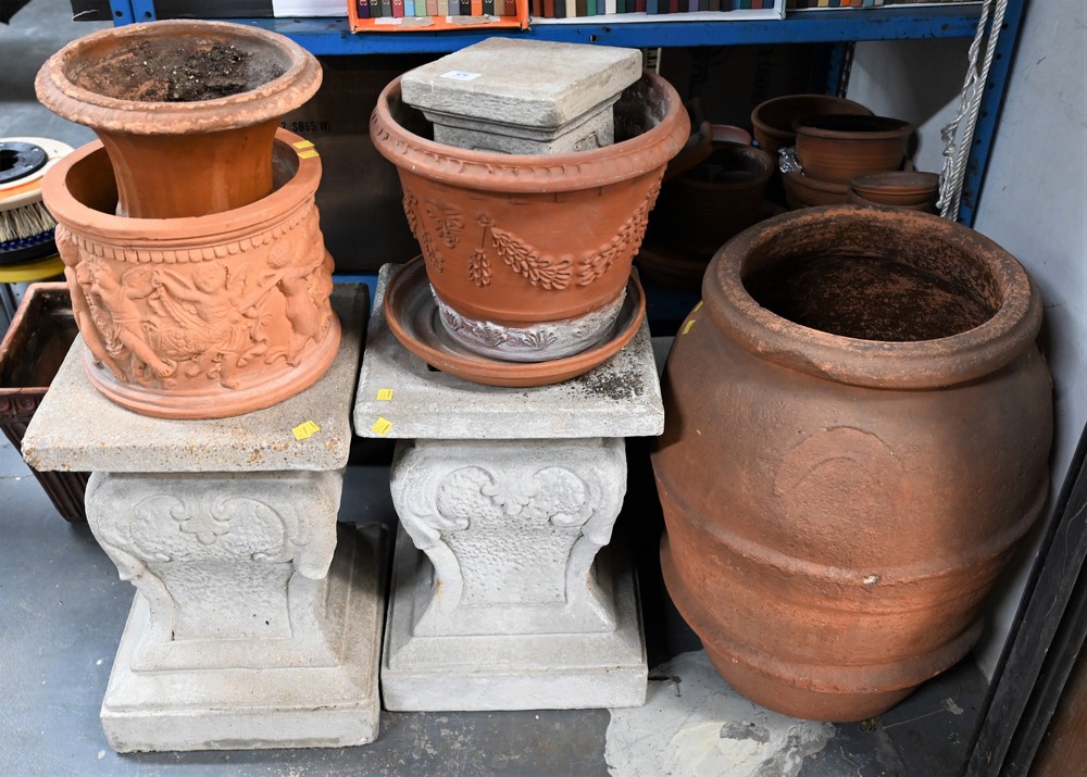 Group of Four Pieces of Earthenware, to include large vessel with green glazed top, pair yellow glazed planters, and a globular vase made into a lamp, lamp height 17 inches.