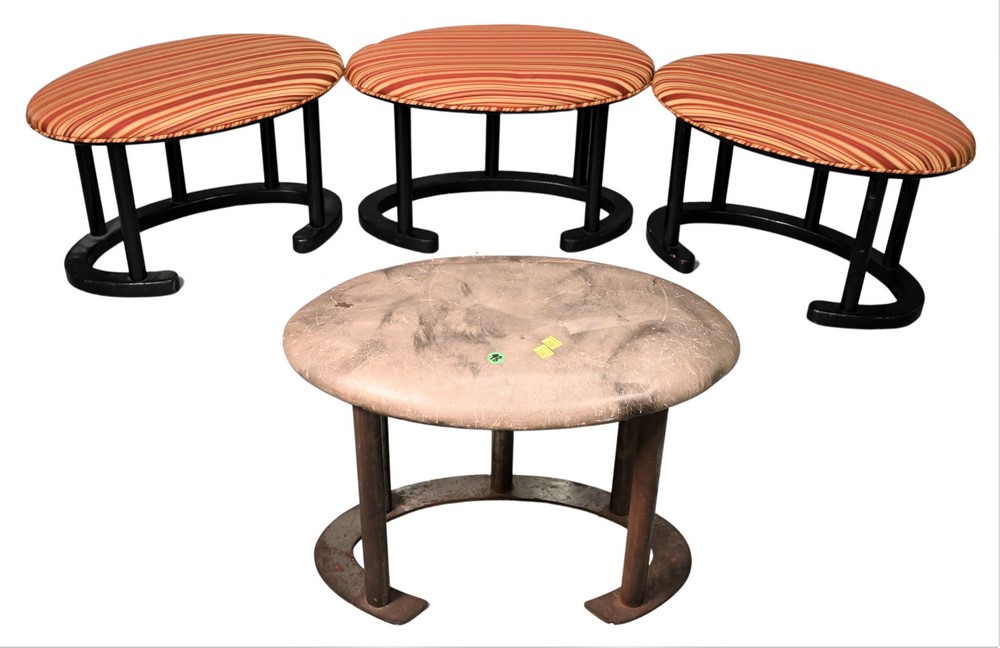 Five Piece Mid Century Lot, to include four oval stools, three with wooden base, one with heavy steel base, along with a steel side table having lift top, stool height 15 inches, top 14″ x 24″.