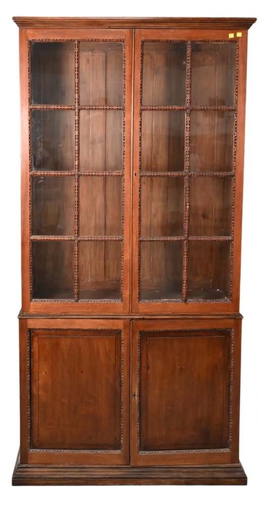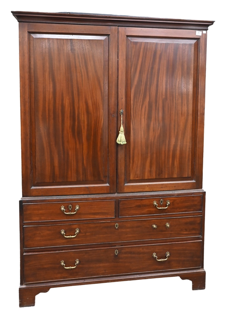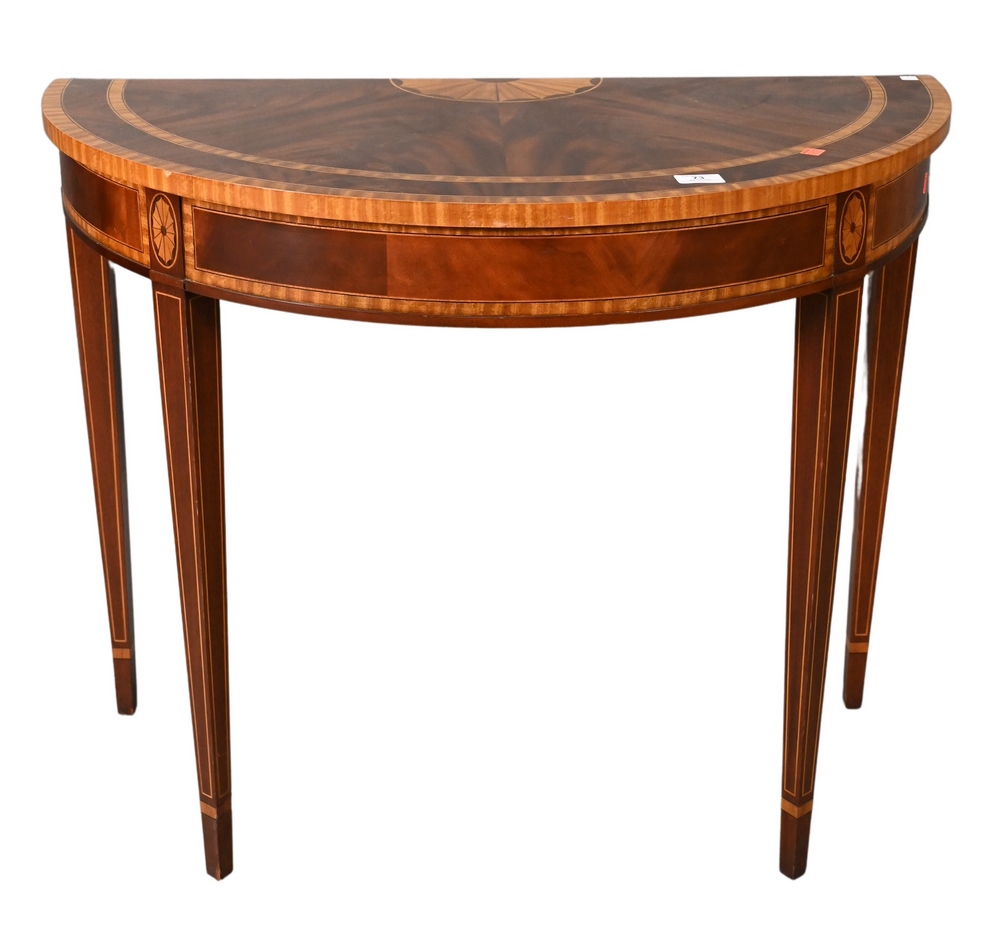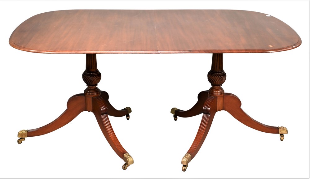 Margolis Custom Mahogany Double Pedestal Dining Table, height 29 inches, top 43 1/2 x 64 inches, along with three 14 inch leaves, top open 43 1/2″ x 106″.