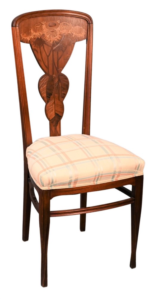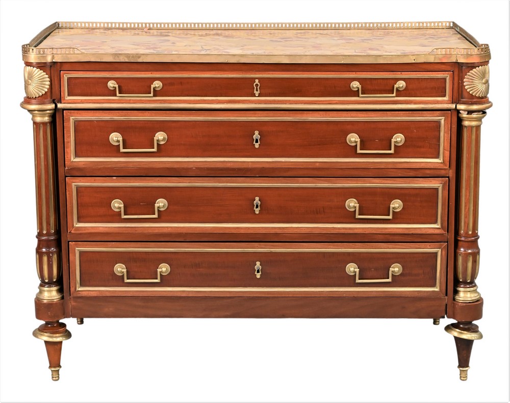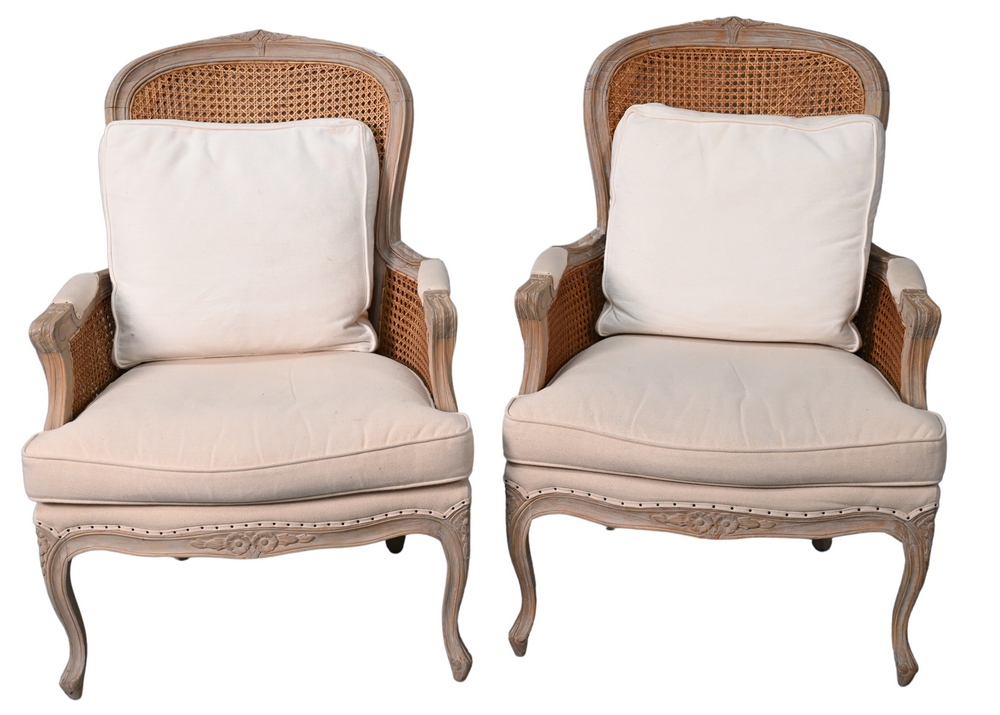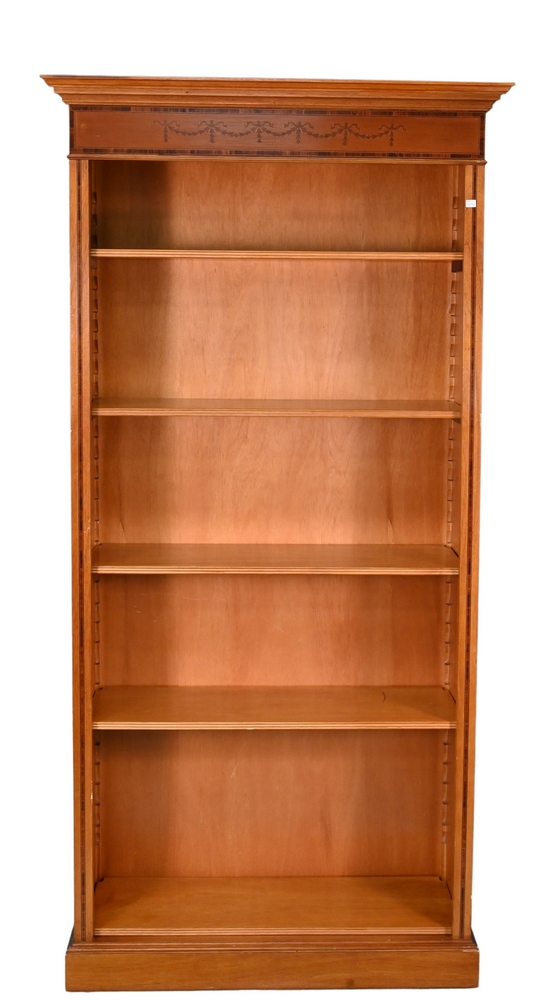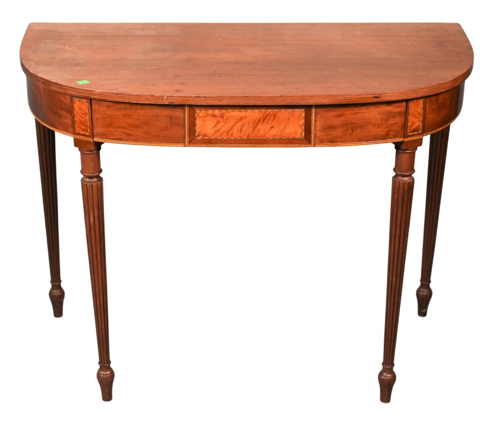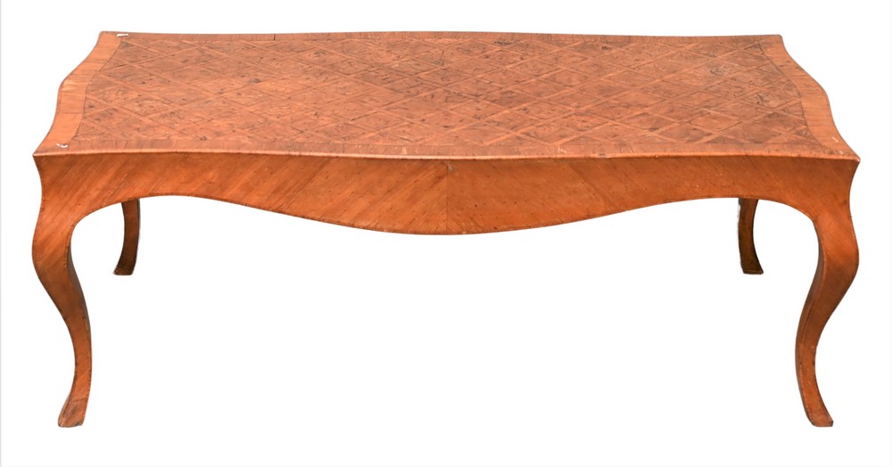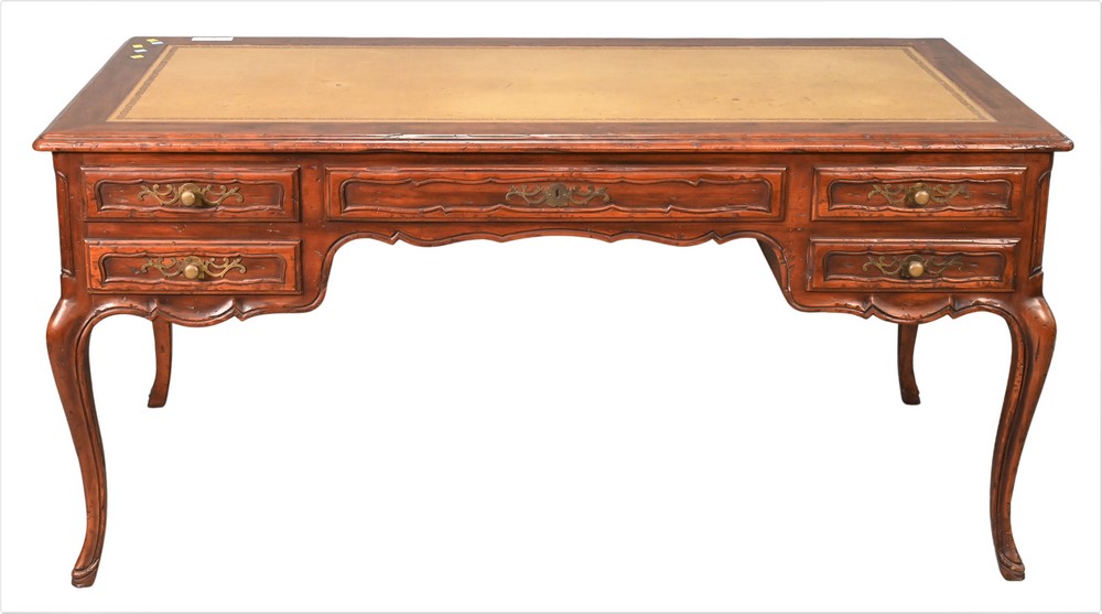 Louis XV Style Fruitwood Desk, having inset leather top, five drawers on one side, and five faux drawers on the opposite side, height 30 inches, top 30 1/2″ x 62 1/2″.