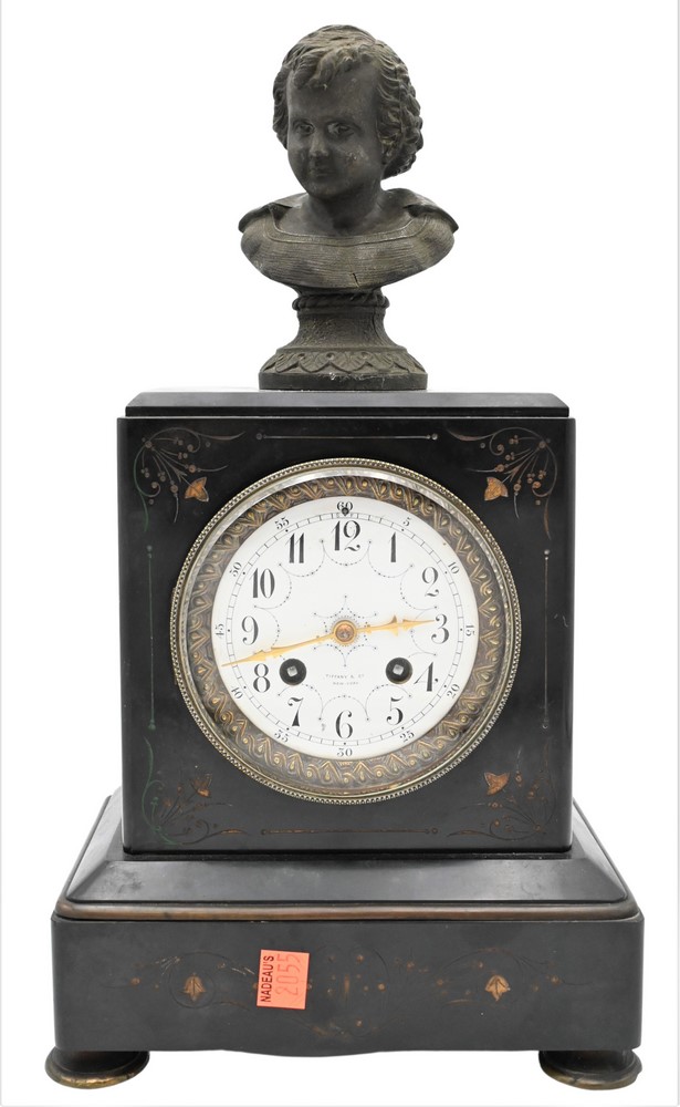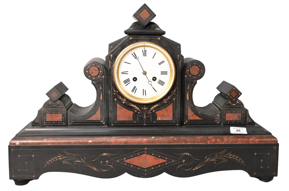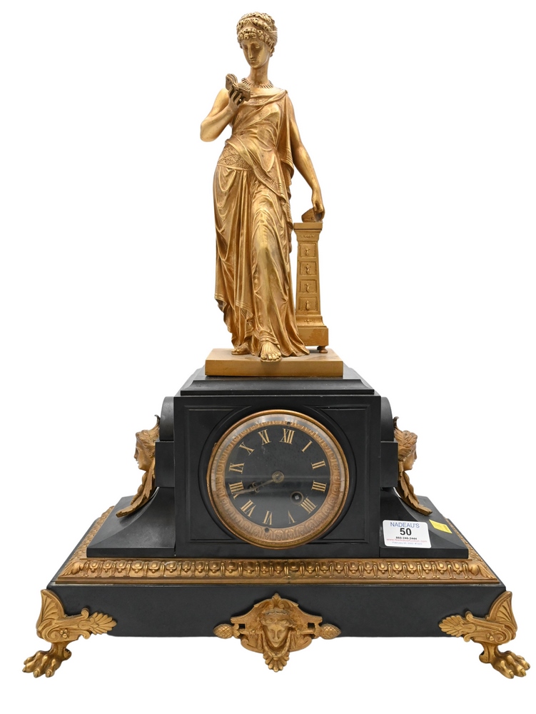 Victorian Black Slate Mantle Clock, having Eutrope bouret bronze classical standing figure reading a book mounted on top, all on claw feet, height 21 3/4 inches.