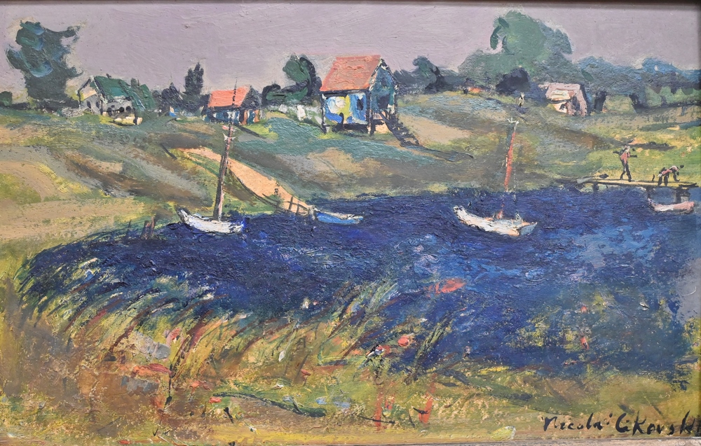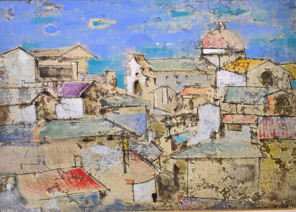 Lazzaro Donati (Italy, 1926 – 1977), S.Spirito De Primavera Cityscape, oil on panel, signed and dated on verso “Lazzaro Donati Firenze 19E”, 19″ x 26 3/4″.