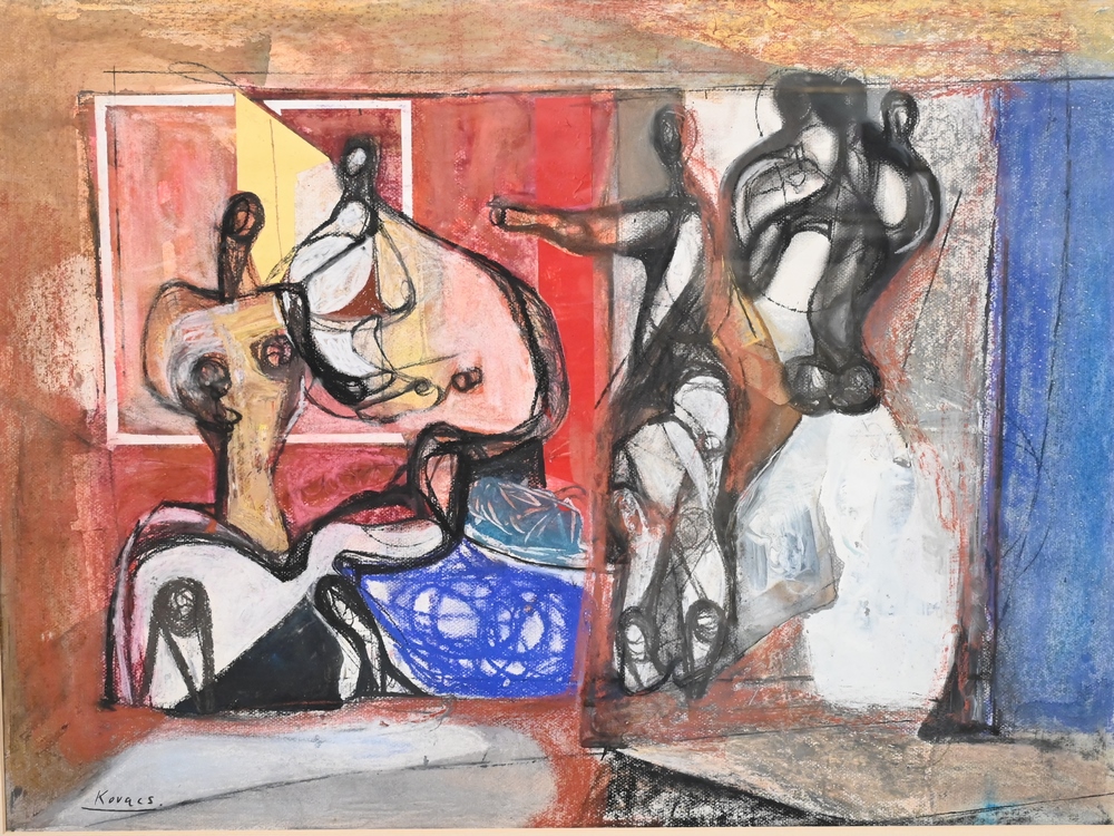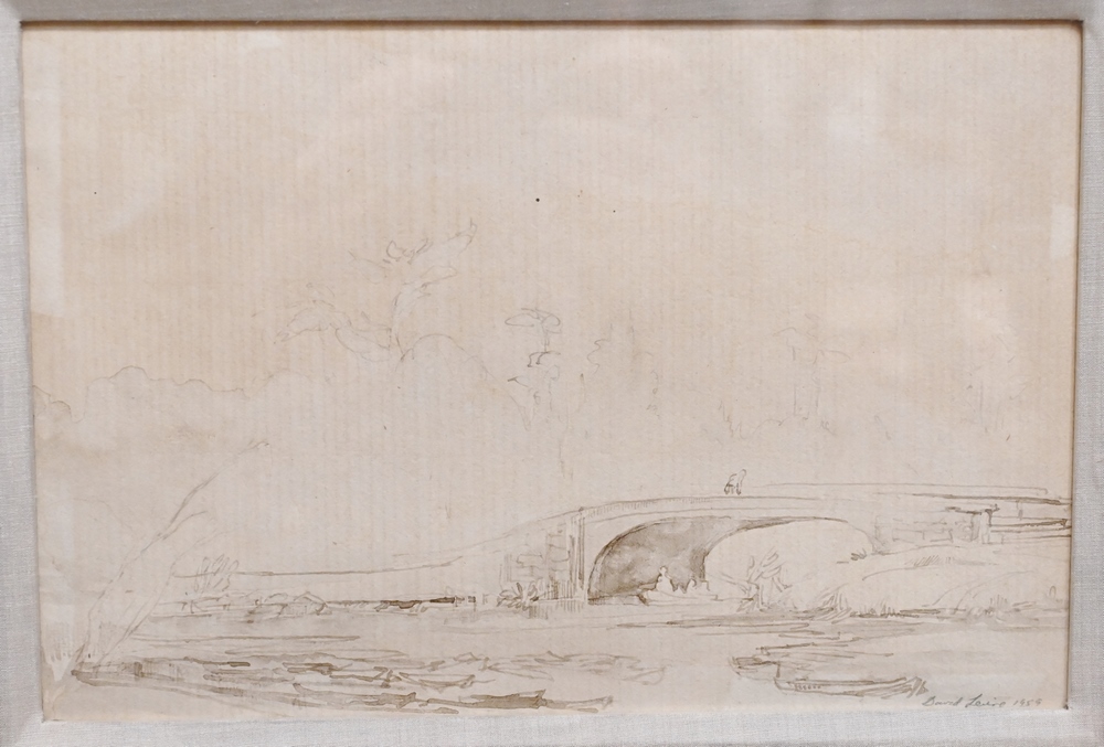 David Levine (1926 – 2009), Across the Bridge, possibly Central Park, signed lower right David Levine, 1959, sight size 6 1/2″ x 9 1/2″, Gallery Fifty-two, New Jersey label verso. Provenance: The Estate of Ed Brenner, Short Hills, New Jersey.
