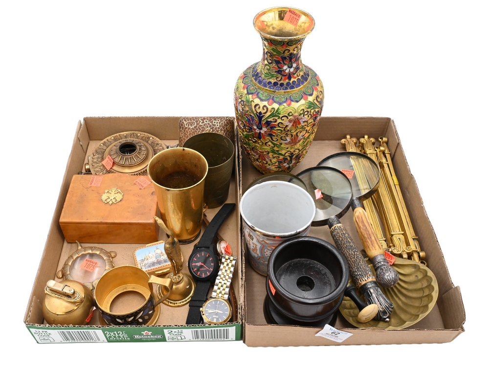 Two Tray Lots, to include Tiffany gilt sterling silver goblet, 18994; Pierre the sommelier corkscrew, Christofle bottle opener; three magnifying glasses, two having stag handles; along with bronze crane bell, etc.