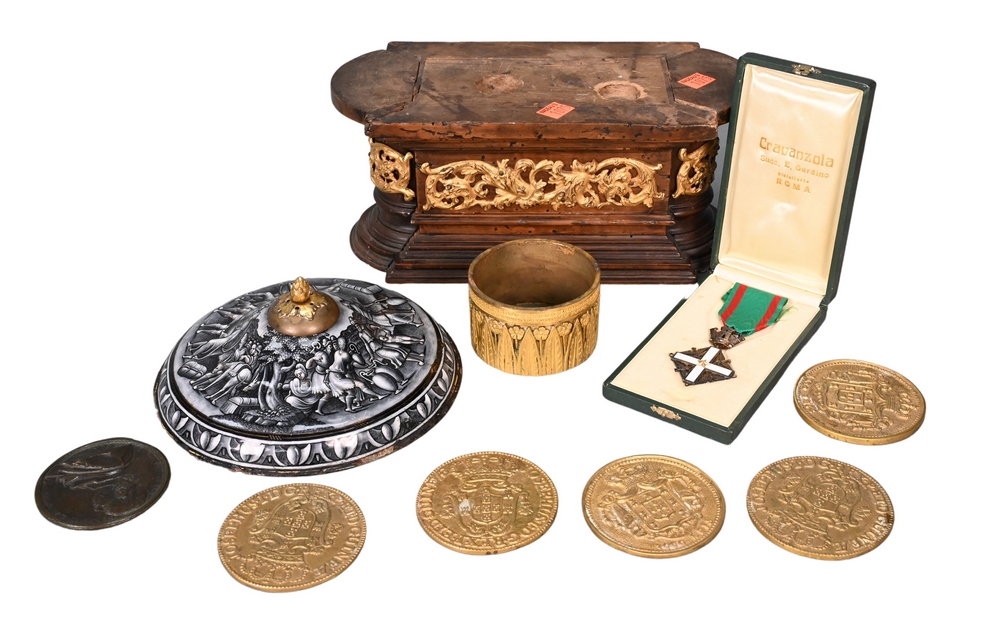 Tray Lot, to include Cheron portrait bronze medal of Gian Lorenzo Bernini, five round bronze, five gilt bronze medals to include 1000 Reis and Guineae Josephus, Cravanzola Roma medal, copper enameled cover with figural scene and a carved base with bronze mounts, along with a Russian icon.