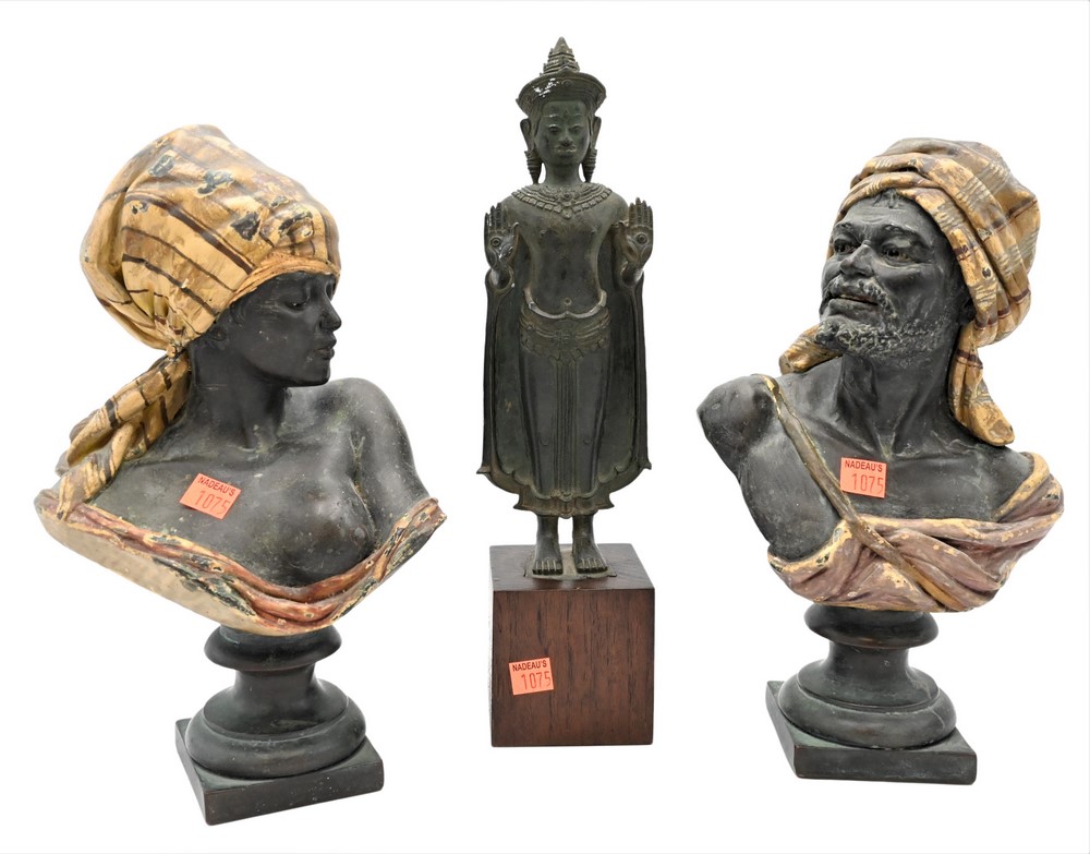 Three Piece Group, to include pair of polychrome metal moorish busts of a man and a woman along with Asian bronze standing figure, morrish height 11 3/4 inches, bronze height 13 3/4 inches.